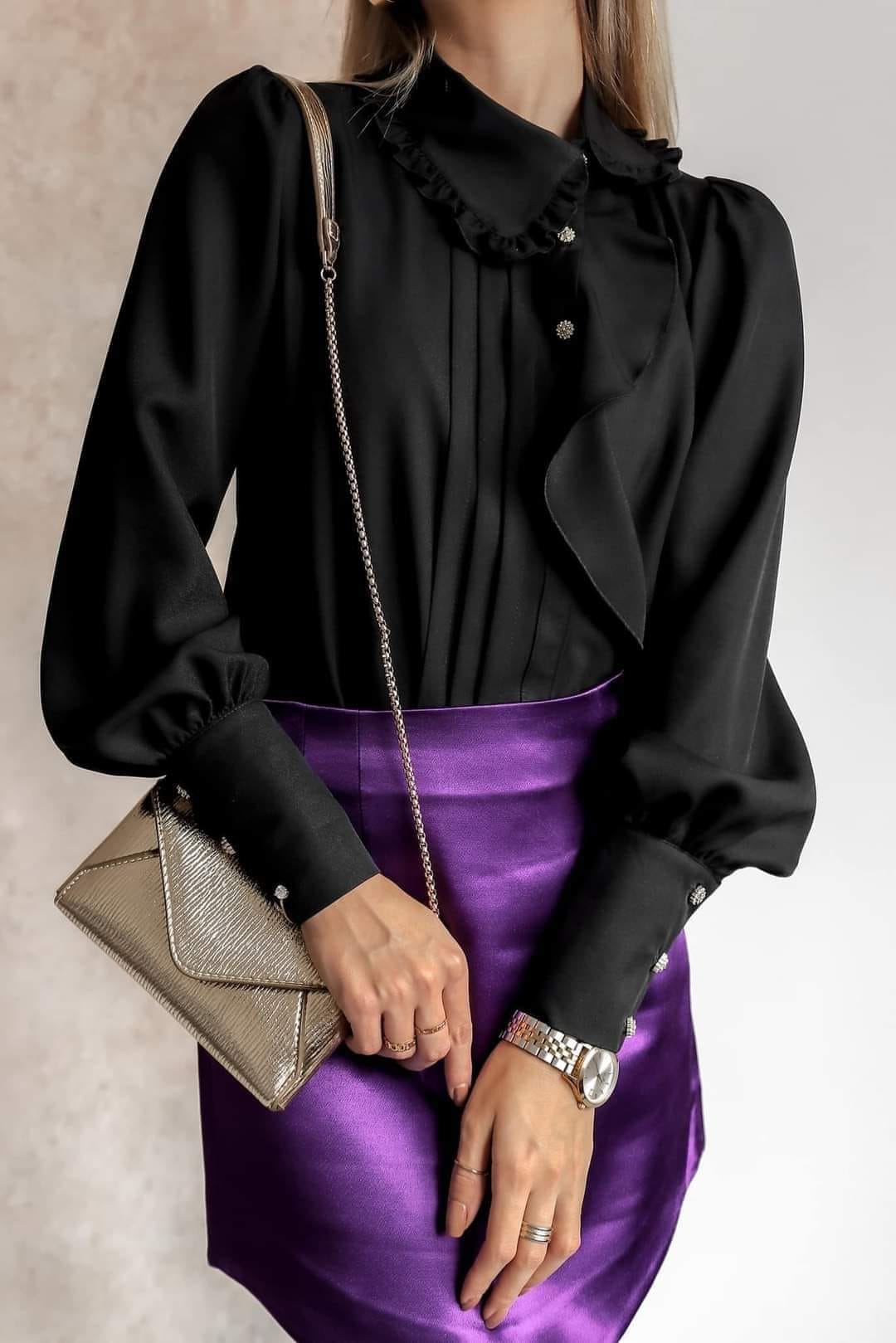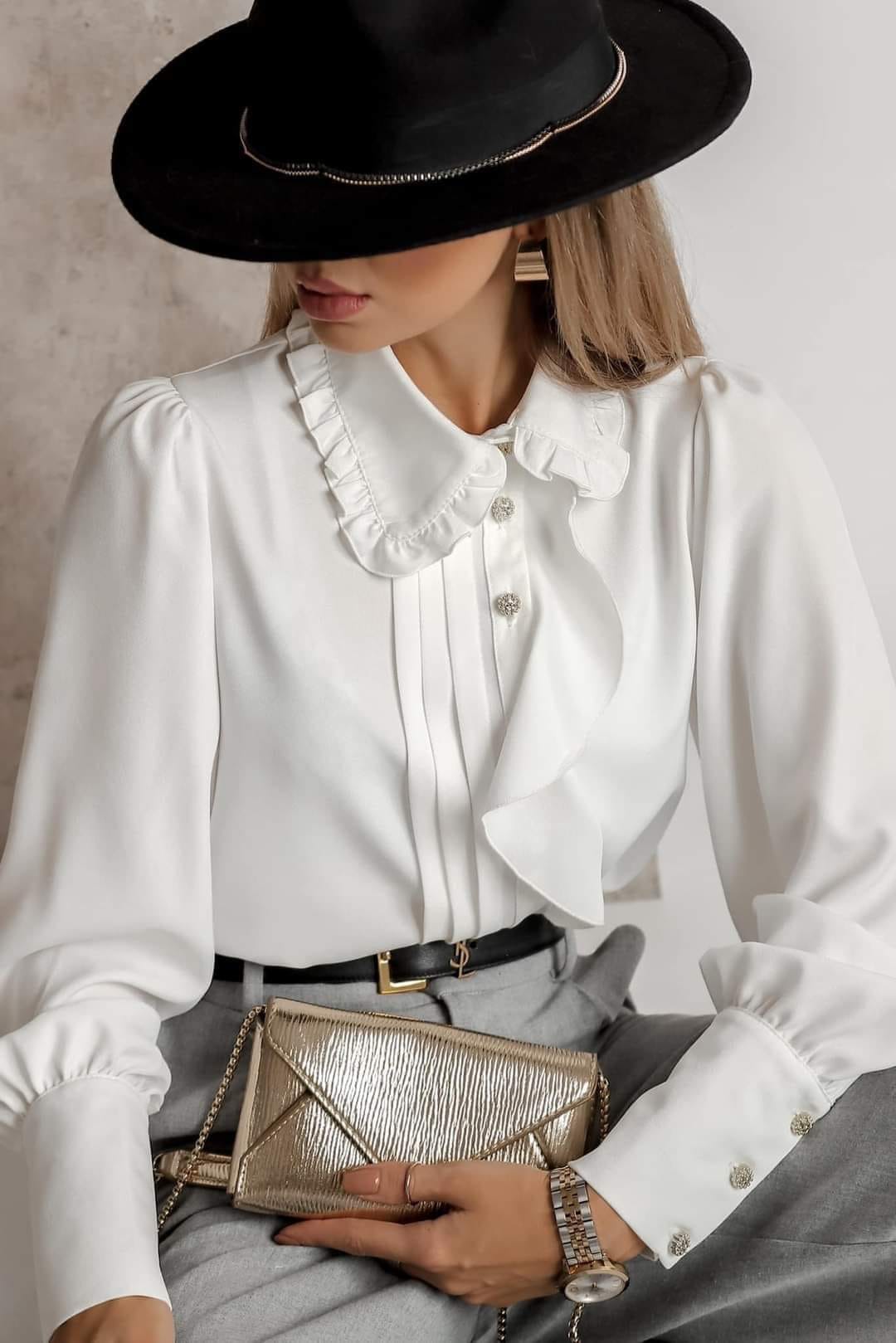 Przepiękna, koszula Megi. Wykończona żabotem oraz plisami. Rękawy zakończone długimi mankietami z ozdobnymi guziczkami. Wykonana z wysokiej jakości materiałów, nie gniecie się.